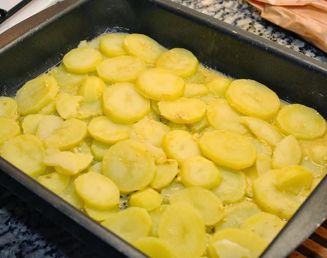 3.Volcamos este líquido sobre las patatas. Dejamos reposar unos 50 minutos para que las patatas absorban el caldo.