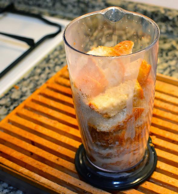 6. Mientras calentamos la leche y troceamos el pan. Una vez la leche caliente empapamos el pan con ella y lo trituramos con la turmix.