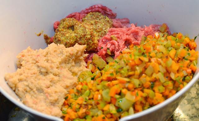 7. Ponemos en un bol la carne picada, la pasta del pan, la mostaza antigua, los dos huevos, la pimienta cayena, sal, pimienta, y la verdura salteada.