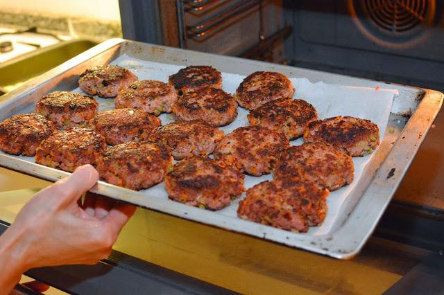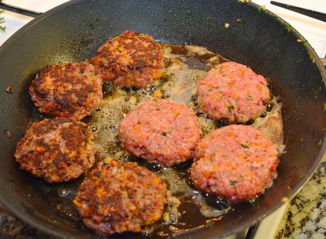 8. Mezclamos bien, muy bien y hacemos las hamburguesas, salen unas 12. Las pasamos por la sartén con mantequilla dos minutos por cada lado.