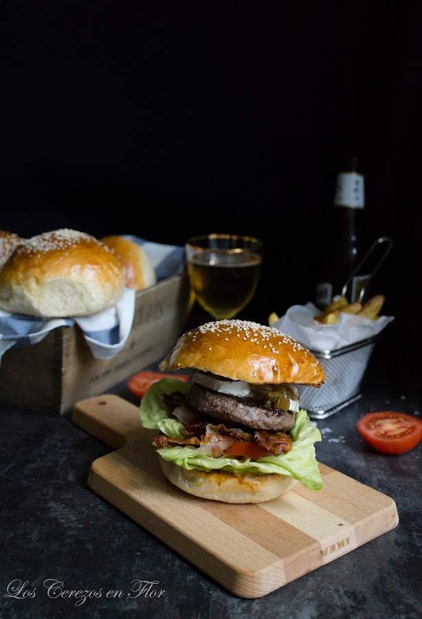 Aquí en Suiza la ternera es cara, y mucho más si la quieres de calidad. De camino al trabajo de mi marido hay una carnicería que al vender al por mayor los precios son más ajustados y la calidad de los productos es excepcional. Así que cada vez que hago hamburguesas en casa para allá que me voy, elijo la pieza de carne que más me gusta o que él me aconseja y me la pica allí mismo, delante mía. Luego los ingredientes que utilizo para mezclarla va a gusto de mis comensales, uno es más de hacerla estilo flamenquín, con su buen jamoncito picado y su aceite de trufa, y en cambio el otro la prefiere al estilo inglés con su salsa worcestershire, tomate concentrado y ajo picado. Para gustos colores no?. Lo que puede complicar aquí un poco la receta es hacer los panecillos. Se tarda un rato pero vale muchísimo la pena, y además sois afortunados, porque después de probar varias recetas os traigo la buena, la que sale perfecta, tiernos, con un sabor fantástico y una consistencia que aguanta a las mil maravillas el peso del relleno. Sólo hay una dificultad, y lo siento mucho pero no dispongo de la solución al tema, lo vais a pasar realmente mal cuando después de pasar unas horas en la cocina preparando los panes nunca llegarán a sujetar en su interior una hamburguesa porqueeeeeee.....se los comerán aunque se quemen la boca en cuanto los saques del horno!!!!! Siempre me pasa lo mismo!! Con esta receta me salen unos 8 panecillos, pues como se de que palo va mi familia, siempre doblo los ingredientes para que me sobren algunos para la cena jajajaja. Yo los he hecho de 150g cada uno, porque mi marido dice que el no quiere mariconadas enanas donde se desparrame todo, el quiere estilo machote, grandes y que se puedan coger con las dos manos y que los dedos no se crucen en el camino jajajajaja, lo que hace la gula!!! No me extraña que sea un pecado capital!! En fin, yo con contentar a los míos hago lo que haga falta!! Aprovecho la entrada de hoy para felicitar a nuestra salmantina más guapa y maravillosa del mundo mundial Rosa al igual que a mi barcelonesa más querida que es mi hermana mayor postiza Maragda , ambas cumplen años!!! Lo que daría yo por compartir estos manjares con vosotras bellas flores de mi jardín!!