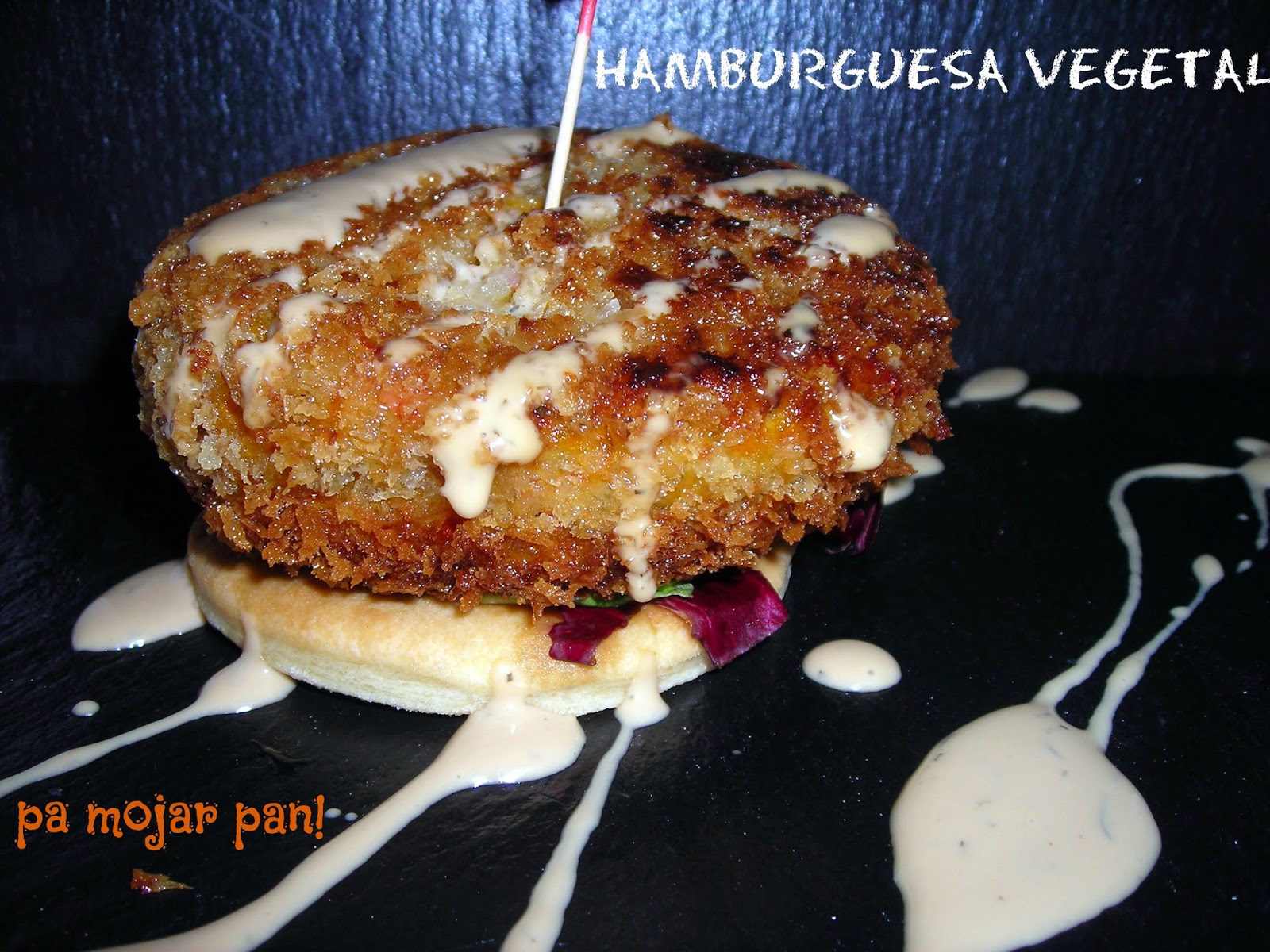 Para el emplatado, disponemos una tostada de pan, unos brotes de ensalada, la hamburguesa y echamos un poco de la salsa por encima.