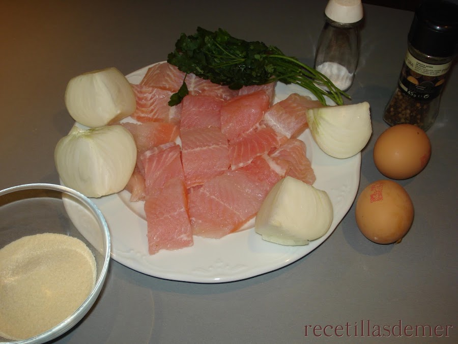 Picar la cebolla y el pescado muy finamente. Yo lo he picado en un robot de cocina. Poner la pasta obtenida en un bol grande y añadir los huevos, el pan rallado, el perejil, la sal y la pimienta.