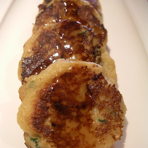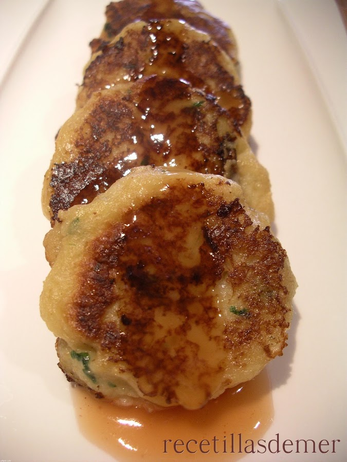 Moldear la masa en pequeñas tortitas o hamburguesitas y freír en aceite caliente, pero a fuego no muy fuerte para que se hagan bien por dentro.