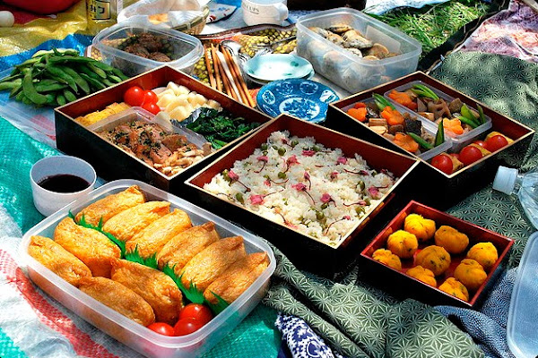 Nota: El Bento en la cocina japonesa es un paquete o caja de comida que se puede llevar fuera de casa y que está compuesta de varias comidas individuales. Se suele llevar en cajas, generalmente con departamentos separados para no mezclar los productos. En este caso se trata de los bentos típicos que se llevan a los picnic que se celebran durante el Hanami en Japón.