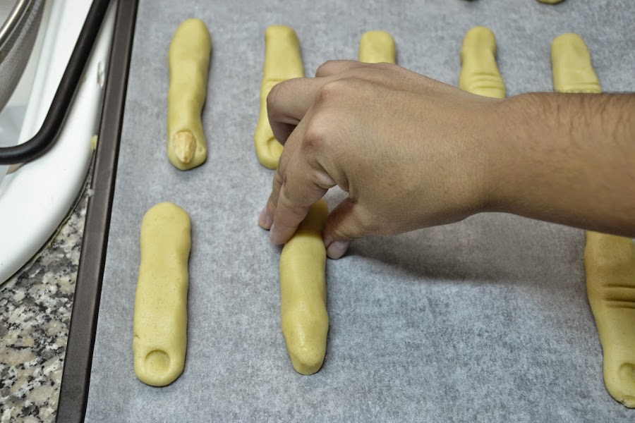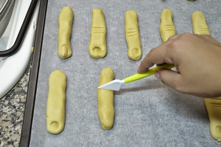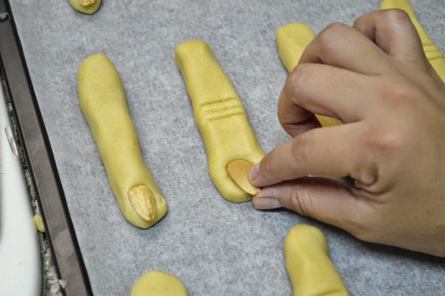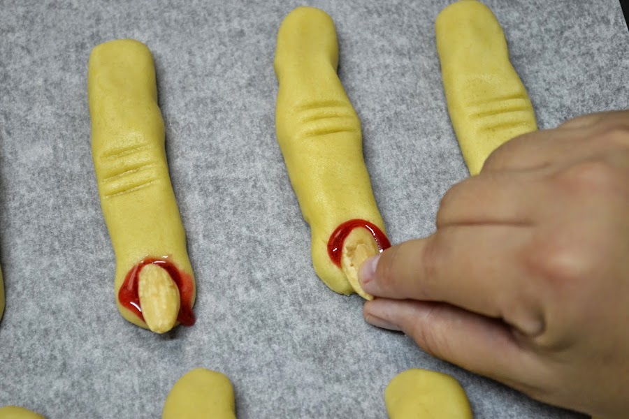 Después de darles la forma de dedo, pon una almendra en la punta como uña, en el caso de las ensangrentadas, pon un poco de sirope de fresa y después la almendra, yo le hice unas lineas para simular la de los nudillos. Tal como se ve en las fotos a continuación.
