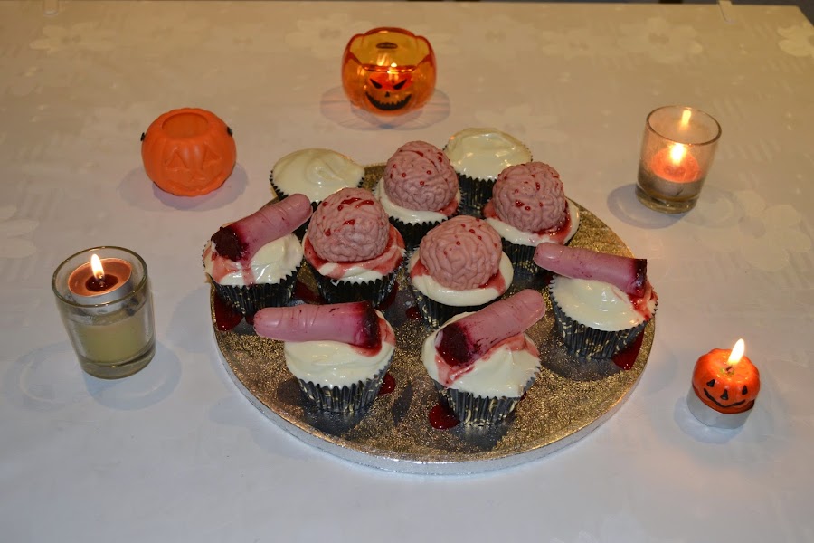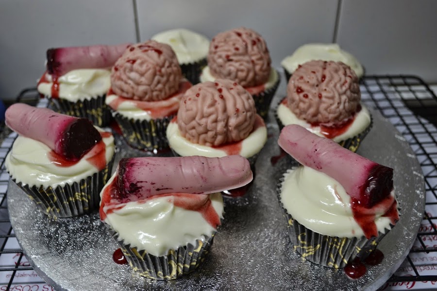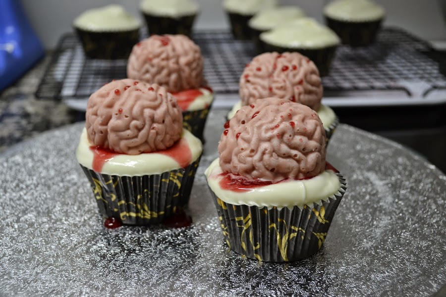 De segundo, te traigo unos cupcakes asquerosos, son unos cerebros ensangrentados, estoy fascinada con esta idea... cuando la vi en internet me juré que tenia que hacerlos! Me encantan y mas siendo una fan incondicional de la serie The Walking Dead, estas cosas me enamoran!