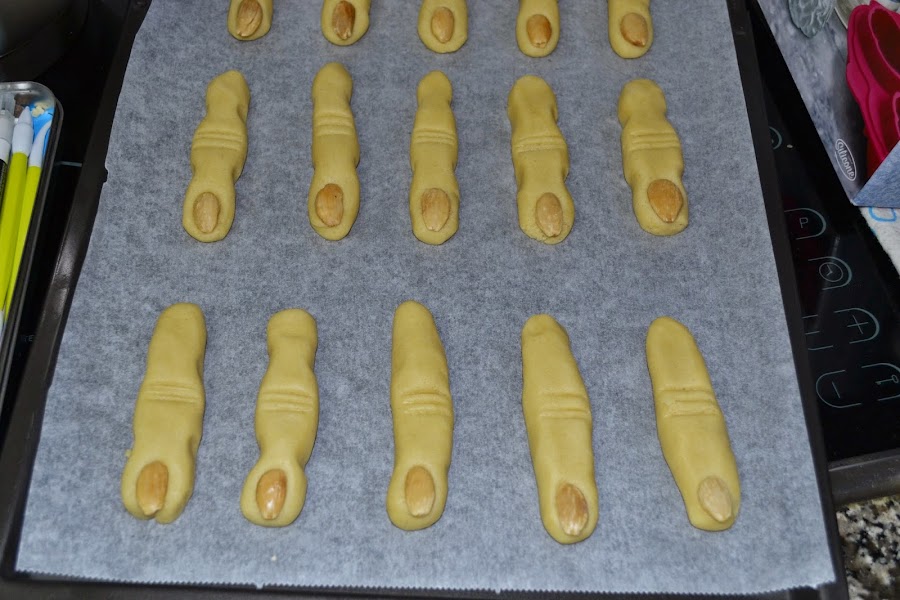 En primer lugar te presento unas galletas en forma de dedo de bruja, tanto normal como ensangrentado... a que se ven asquerosos? Pero están riquísimas, no te miento!