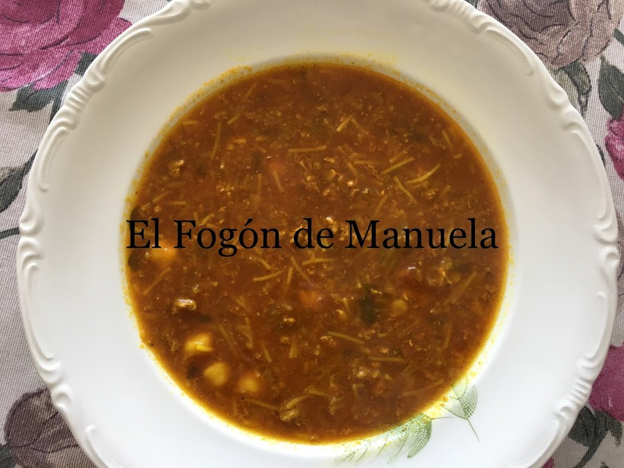 Todo esto lo agregamos a la carne con la cebolla, y ya le pondremos el agua, las especias y los demás ingredientes excepto los fideos y los garbanzos.