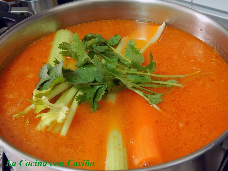 Venga vanos con la receta. Comenzamos haciendo un sofrito con la cebolla y el aceite de oliva a fuego suave y con un poco de sal para hacerla sudar. Cuando empieza a tomar color añadimos los tomates, el laurel y un par de minutos después el pimentón. Sofreímos un par de minutos y añadimos la carne, las zanahorias y el apio y acto seguido 3 litros de agua. Dejamos que rompa a hervir y cocemos como 45 minutos. Espumamos, si lo vemos necesario.
