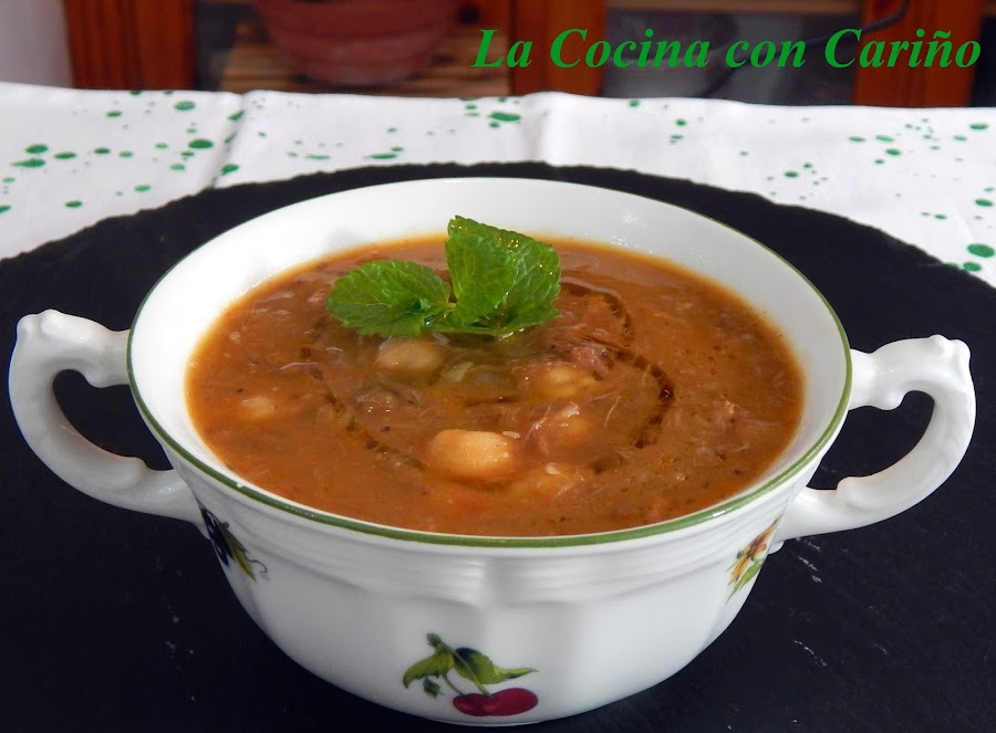 Pasado este tiempo, retiramos el apio y la zanahoria, y con un poco de caldo, trituramos esta última, desechando el apio. Vertemos esta crema en el caldo y añadimos los garbanzos. Seguimos a fuego lento y sin olla exprés, por favor. Finalizando la cocción de los garbanzos, salpimentamos y echamos todas las especias, junto con las hierbas.