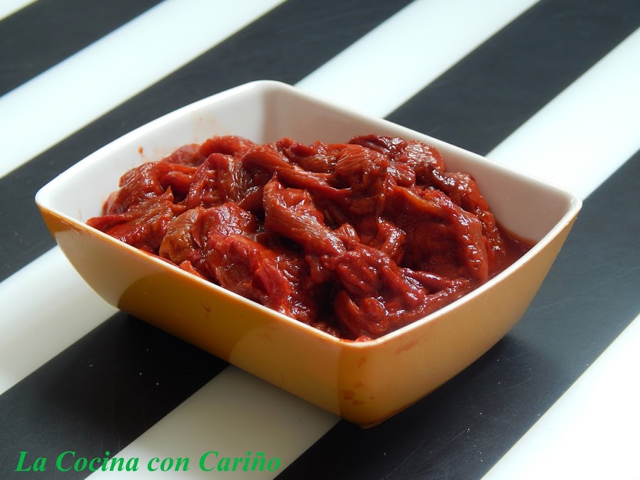 - 5 pimientos cristal secos en remojo con agua templada. Un par de horas. Yo preferí no triturar la piel y saqué la pulpa con una cucharilla.