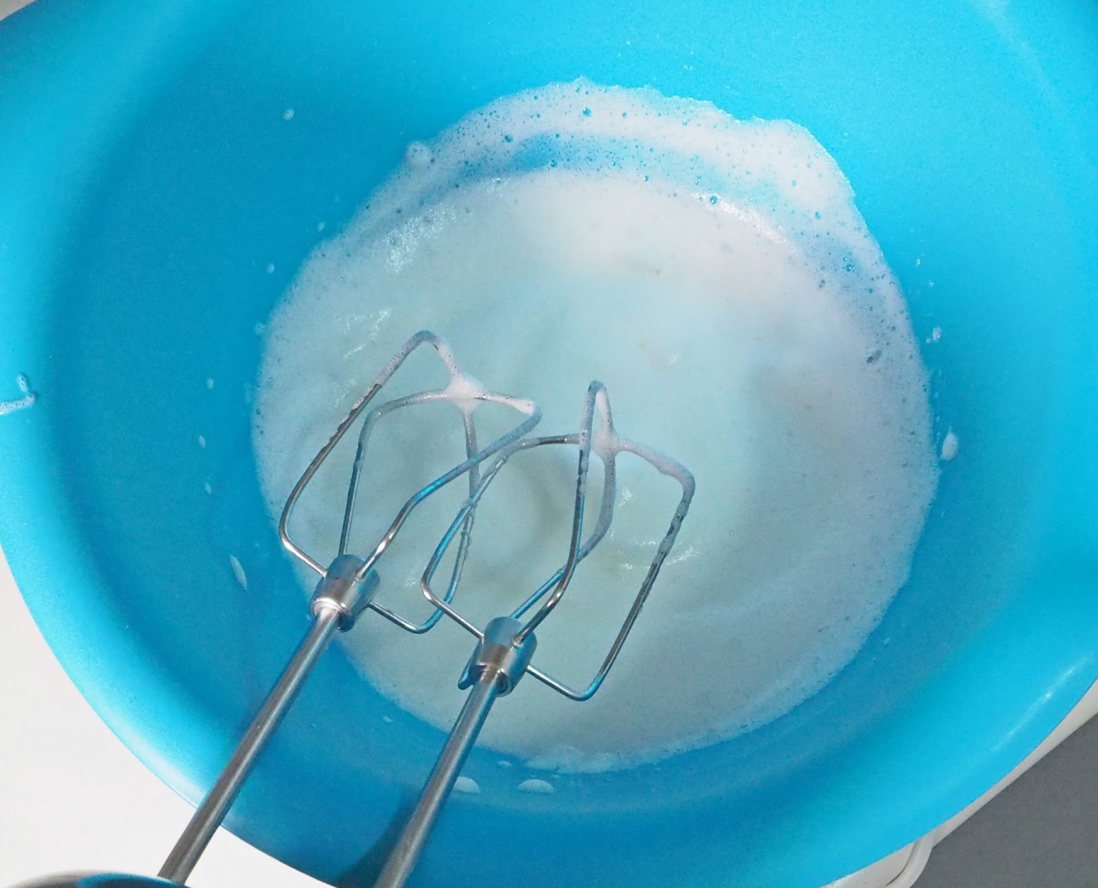- Seguidamente vamos añadiendo el azúcar, poco a poco, hasta que obtengamos un merengue firme y se formen picos.
