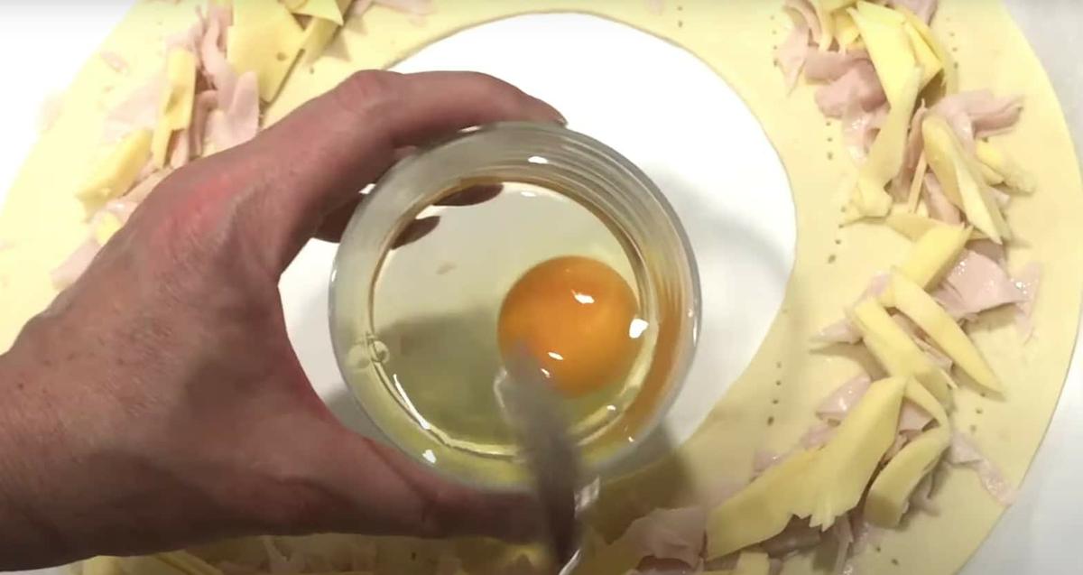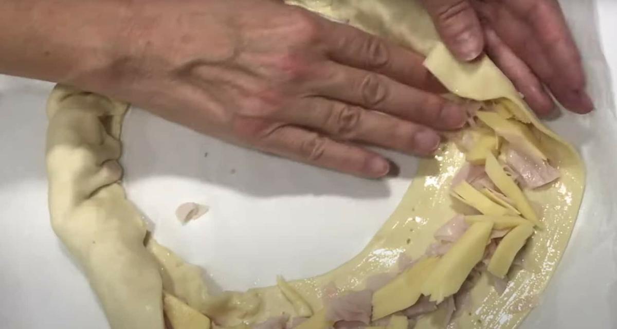 Para hacerla, extendemos la masa de pizza y le hacemos un agujero en el centro.