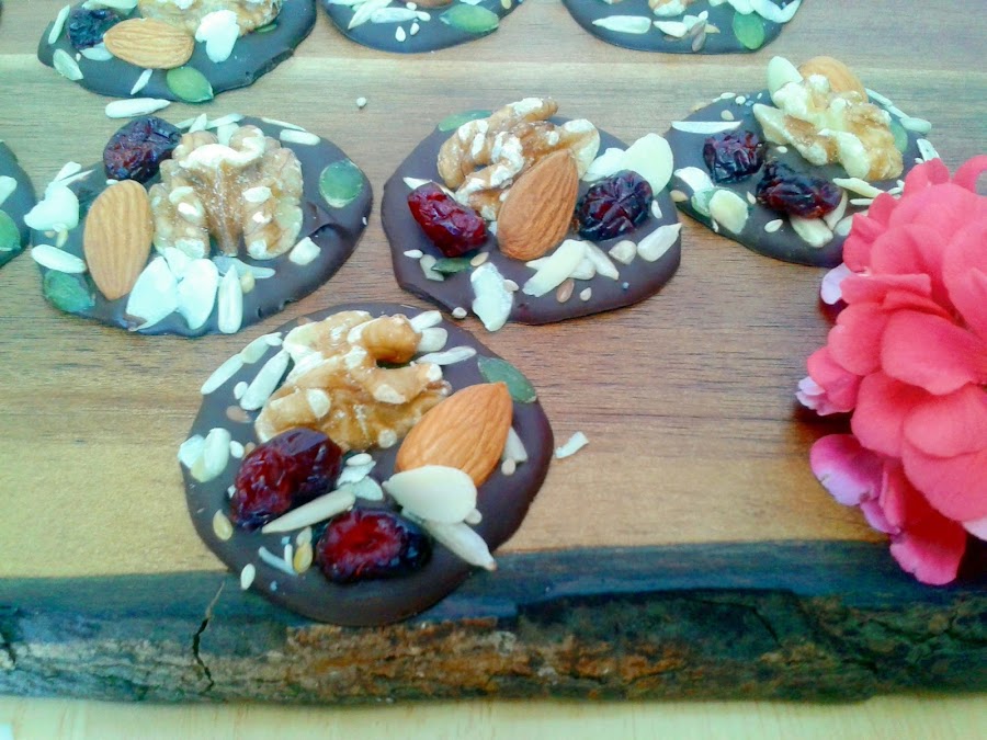 A baño maría derretiremos el chocolate, podéis utilizar chocolate en tableta o en pepitas. Removemos continuamente hasta que el chocolate está cremoso. Se puede hacer en el microondas, en intervalos muy breves. Sobre una lámina de papel del horno, colocaremos el chocolate de a cucharadas, de tamaño similar a una moneda. Dejamos templar un poco y espolvoreamos con las semillas, presionando muy suavemente para adherirlas. Colocamos en cada snack una almendra, una nuez y unos arándanos.