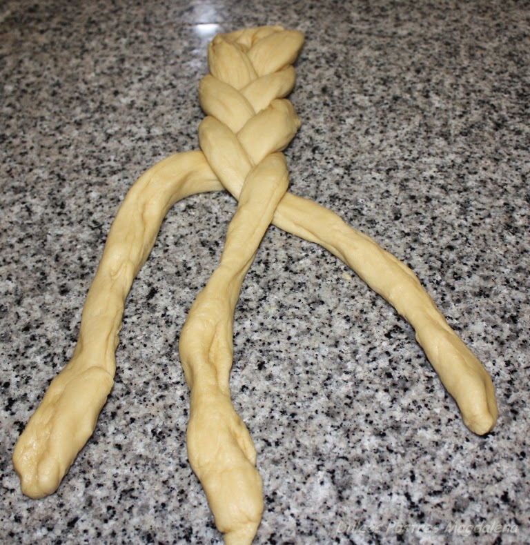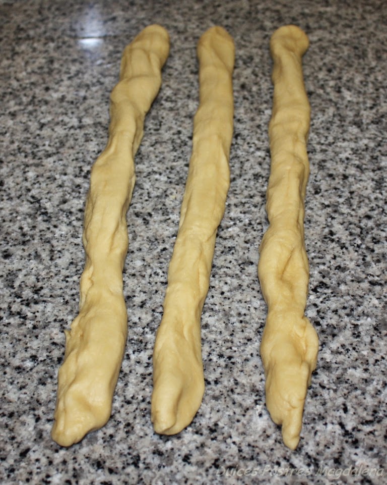 Dividirla en tres partes iguales. Coger cada trozo de masa y y con la palma de la mano formar un rollo grueso. Con las dos manos ya seguir extendiendo el rollo hasta conseguir unos 15 centímetros de largo. Unir las tres piezas por uno de sus extremos y doblar la unión hacia abajo. Hacer una trenza suelta (para dejar que doble su volumen).