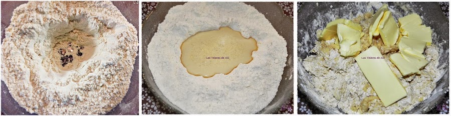 Haz un hueco y vierte en él la mezcla de leche. Añade la mantequilla derretida al bol y mezcla bien toda la masa.