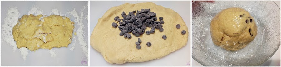 Añade las perlas de chocolate y forma una bola. Tapa con film transparente y déjalo dentro de un bol previamente untado en aceite vegetal.
