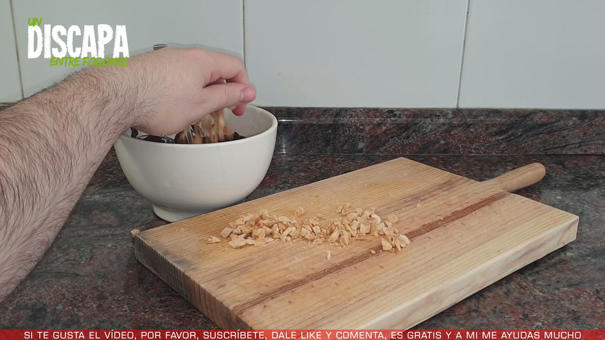 3Ahora troceamos unas almendras, yo voy a utilizar almendras ya tostadas y sin sal. Si vuestras almendras no están tostadas las podéis tostar en la sartén o en el horno. Las vamos troceando finamente y las incorporamos junto con el chocolate.