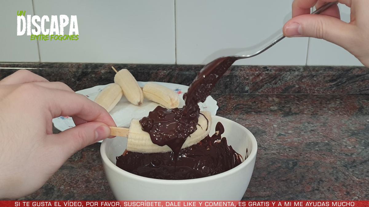 4Ahora sacamos los plátanos del congelador y los cubrimos con la mezcla de chocolate y almendras. Y como el plátano está congelado el chocolate enseguida se va a solidificar. Y ya estarían listos, ahora si se quiere se pueden consumir seguido o se pueden congelar en el congelador hasta el momento de consumirlos.