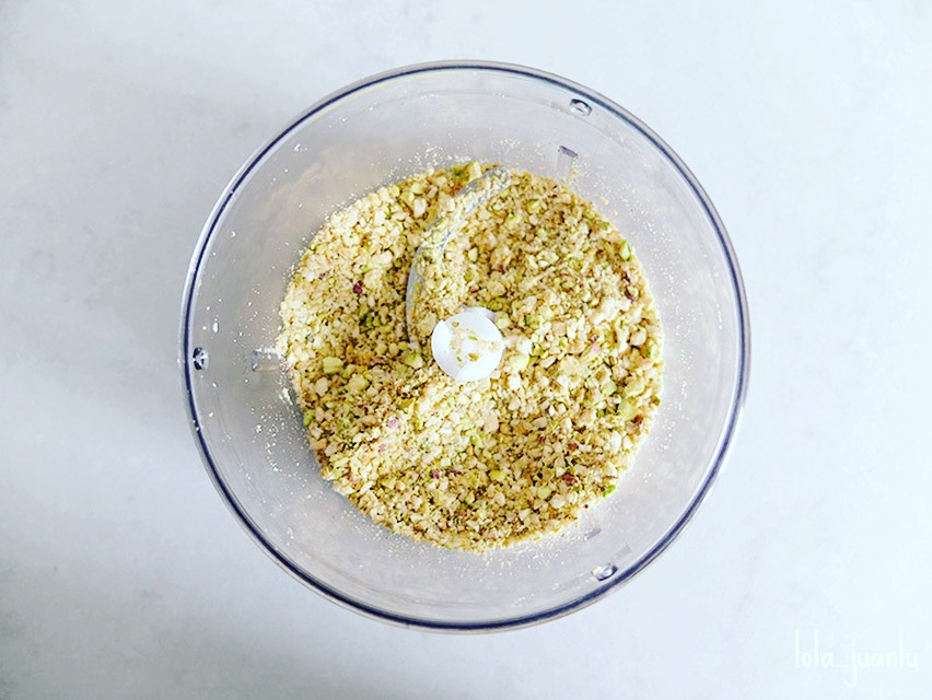 Lo primero que vamos a hacer es preparar los ingredientes y utensilios que vamos a necesitar. Sacamos el helado de vainilla del congelador. Sacamos el fruto de los pistachos y los trituramos con ayuda de un robot de cocina. Pelamos y trituramos los mangos.
