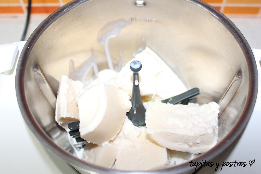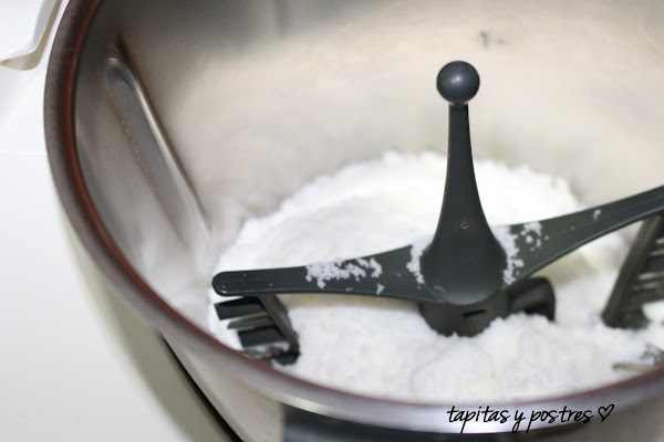 Colocamos la mariposa en las cuchillas y sin quitar el azúcar ponemos la leche congelada en trozos, la montamos unos dos minutos a velocidad 3.