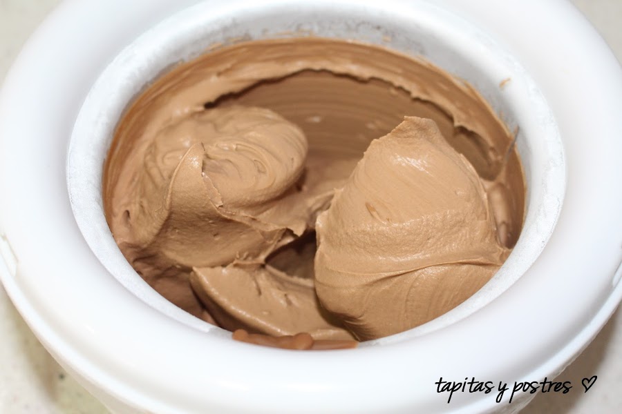 Si lo preparamos con heladera, metemos la mezcla fría y dejamos que se vaya mantecando durante unos 45 minutos. según vuestra máquina. La mía a los 40 minutos, ya estaba así. Recordad, que la cuneta de la heladera debe estar al menos 24 horas en el congelador.