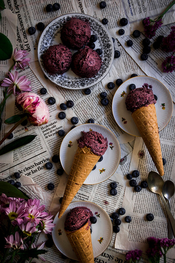 Al final deja a congelar el helado. Unos minutos antes de servir, saca del frigo el helado para esté más cremoso y es más fácil de servir.Cada vez que como helado siento el verano en mi cuerpo: el calor, las tardes eternas, el sol qué fácil es vivir en verano (excepto las olas de calor seamos sinceros). Además yo soy una gran amante de los helados de frutas y en verano es fácil encontrar frutas del bosque, melocotones o cerezas. Por eso querría hacer este helado de arándano. Es una receta diferente porque en vez de azúcar uso miel. Hace un par de semanas me decidí hacer mas recetas con miel. Además la miel es un azúcar invertido natural y al usarla en los helados ayuda que no formen cristales en el helado.