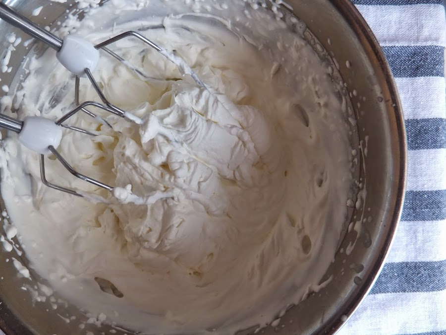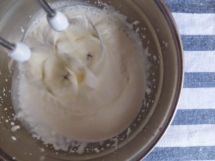 3. En un bol monta la nata (crema de leche) hasta que forme picos. (La nata (crema de leche) es preferible que esté fría, de la nevera, porque de lo contrario es más fácil que se corte).