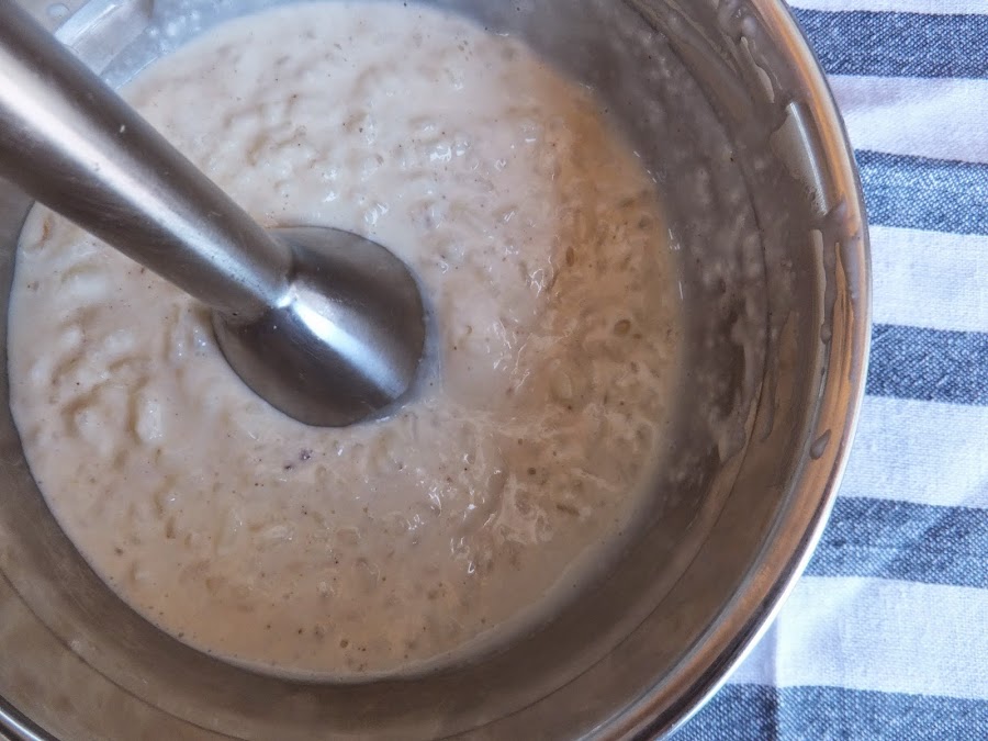 2. Cuando el arroz con leche esté listo separa 500 gramos y tritura con una batidora hasta conseguir una crema o bien un poco menos si prefieres conservar algunos granos de arroz enteros. Mete la crema en la nevera hasta que esté bien fría. (3-4 horas o una noche)