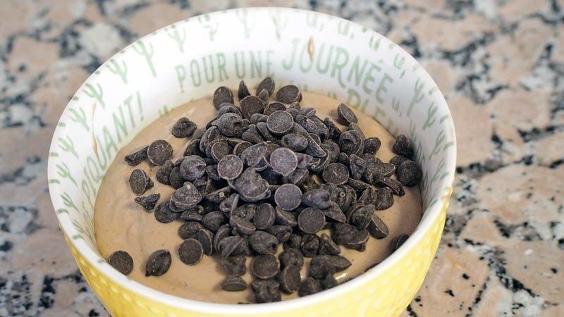 Trituramos todos los ingredientes hasta obtener un helado cremoso. Lo pasamos a un recipiente y le incorporamos las pepitas de chocolate o el chocolate troceado. Removemos hasta integrar dentro de la crema de helado.