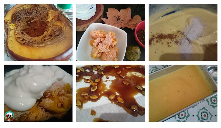1.- Asamos la calabaza durante 50 o 60 minutos con el horno a 200ºC y envuelta en papel de aluminio. La retiramos del Horno, la sacamos del papel de aluminio y la dejamos enfriar. Una vez este fría le quitamos las semillas y las hebras. La guardamos en el congelador 6 o 7 horas.