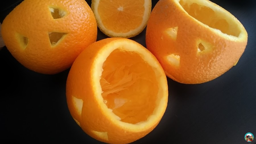 3.- Preparamos las naranjas: lavamos bien las naranjas, las secamos con papel de cocina. Con un cuchillo le cortamos la parte superior. Cortamos el borde de la piel por dentro, separando la naranja de la piel sin romper la piel de la naranja. Con la ayuda de un tenedor vaciamos con cuidado cada naranja. Vertemos el jugo y su carne un un bol. Una vez estén vacías, le hacemos unos cortes para hacer los ojos, la nariz y la boca. Las lavamos de nuevo. las secamos y las guardamos en la nevera hasta el momento de servir el helado.
