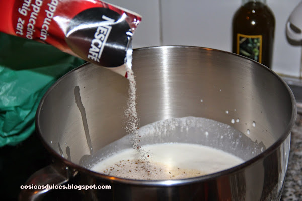 Desde que hace unos años descubrí el placer de disfrutar de un helado casero son pocas (o casi ninguna) las cremas heladas comerciales que compramos en casa. Lo cierto es que es muy sencillo prepararlos y el resultado es fabuloso: helados cremosos y de todos los sabores imaginables. Yo normalmente los preparo en heladera (yo lo he dicho en más de una ocasión pero lo repito: que buena compra hice con esta maquinita) pero si no se dispone de ella se pueden hacer igualmente. La única diferencia es que al meterlos en el congelador las dos primeras horas debemos removerlos cada media hora para evitar que cristalice. En esta ocasión aproveché unos sobrecitos de Capuchino que recibí en mi caja Degustabox para hacer este helado que os recomiendo de forma insistente porque está riquísimo y porque es fabuloso para combatir este verano tan caluroso que estamos teniendo. Espero que os guste. Fuente de la receta: Mundorecetas.