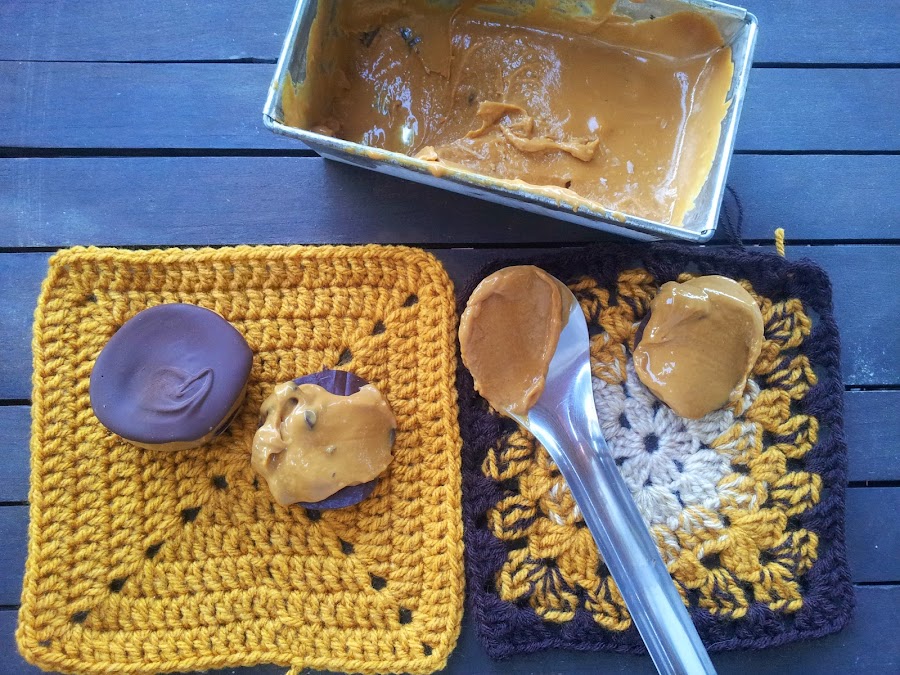 Atemperar una tableta de chocolate, hacer unas galletas sobre papel vegetal, y cuando hayan endurecido, si hace mucho calor las podéis meter un ratito en el frigorífico, rellenar con el helado.