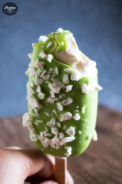 Al día siguiente preparamos el glaseado, troceamos y fundimos el chocolate junto con la manteca de cacao, le añadimos los colorantes hasta conseguir un tono de verde que recuerde un poco al de la vaina de cardamomo, yo lo he conseguido mezclando amarillo y azul, más amarillo que azul, cuando tengamos el color deseado dejamos enfriar hasta los 35ºC, desmoldamos los helados, los bañamos con el glaseado y rápidamente esparcimos el crispy de leche de coco por encima.