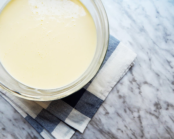 Pasamos la crema por un colador a un bowl limpio y cubrimos con plástico autoadherible, presionando el plástico sobre la superficie de la crema. Dejamos que tome temperatura ambiente, para después llevar a refrigerar por al menos 4 horas o hasta tres días. (Yo la deje toda la noche en refrigeración).