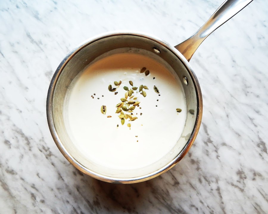 Ponemos la leche y crema en una olla de fondo grueso con una cucharada de azúcar, el resto lo reservamos, (esto es para evitar que el liquido se derrame al hervir). Abrimos 6 vainas de cardamomo y las agregamos con el resto de vainas si abrir a la olla (esto hará que tenga más sabor). Llevamos a hervor lentamente.
