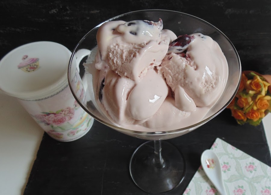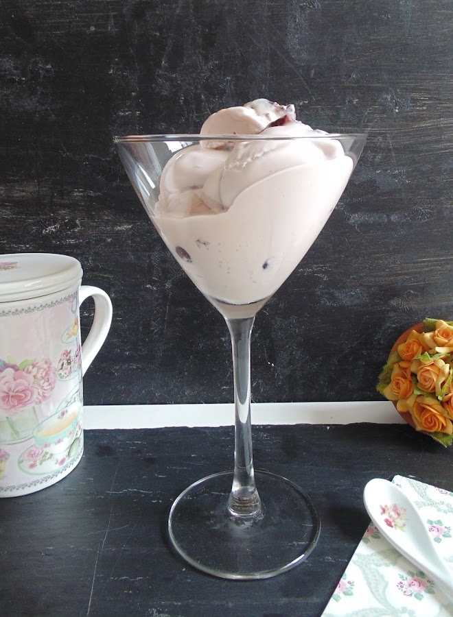 Yo utilicé cerezas picotas, pero podemos usar las que más nos gusten. Como siempre, lo hice con mi máquina de hacer helados, pero como os he explicado en otras ocasiones, también puede hacerse metiendo la mezcla en el congelador: la sacamos cada hora durante 4 horas para removerla bien y evitar que se formen cristales grandes, hasta que obtengamos la textura deseada. Como en otras ocasiones utilicé leche evaporada en lugar de nata (crema de leche) para rebajar un poquito las calorías, y no le puse huevos para ahorrarnos los sustos que pueden darnos en verano. Por lo demás, veréis que es una receta fácil y deliciosa.