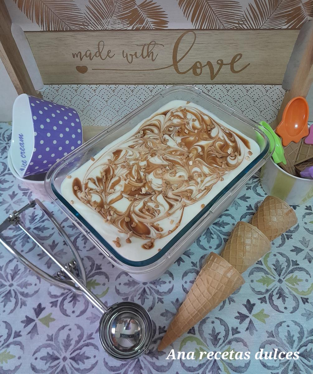 En el recipiente donde lo vamos a congelar, echamos de 2 a 3 dedos de la mezcla de helado, seguidamente agregamos salsa de caramelo en forma de zig zag, a continuación ponemos otra capa de helado y encima salsa de caramelo, así seguiremos hasta acabar con la mezcla de helado.