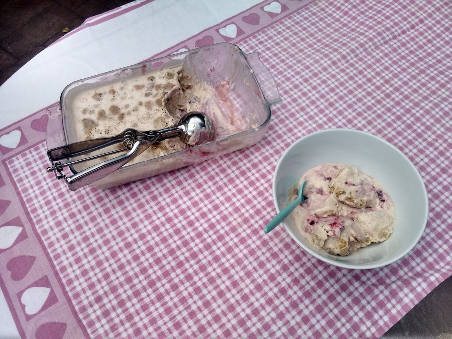 Para empezar colocamos todos los ingredientes para hacer la base del helado y los mezclamos en un vaso batidor o en un robot de cocina hasta que no haya grumos. Pasamos esta mezcla a la heladera ( para que se vuelva cremoso el vaso de la heladera hay que meterlo un mínimo de 24 horas antes de hacerlo en el congelador). Y lo dejamos hasta que veamos que se ha vuelto cremoso. Si no tenéis heladera meted el helado en el congelador 45 minutos y removemos enérgicamente con unas varillas y volved a meterlo,esto hay que hacerlo cada media hora durante 2-3 horas hasta que veáis que el helado esta cremoso y sin cristales de azúcar.
