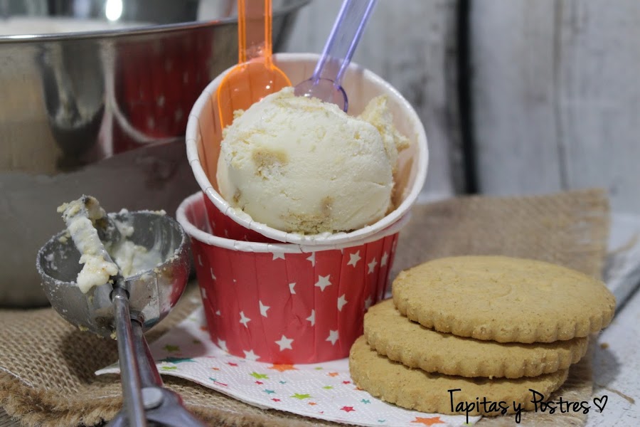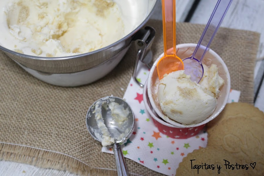 Quitamos la mariposa y trituramos la nata (crema de leche) junto con la crema congelada que teníamos reservada 30 segundos a velocidad 7. Bajamos los restos que haya en las paredes y vertemos en el recipiente donde lo vayamos a congelar. Añadimos las galletas troceadas a mano, trocitos ni grandes, ni chicos. Mezclamos con una espátula y al congelador hasta la hora de servir. Antes de servir lo dejamos fuera unos diez minutos para poder hacer bien las bolas. Lo podemos acompañar de almendra crocanti, unos hilos de mermelada, migas de galletas...da igual lo que le pongáis os lo vais a comer sin mirar.