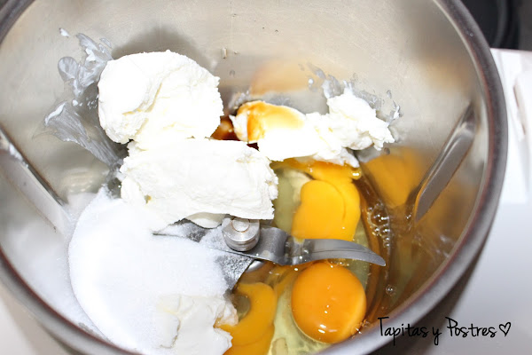 Queso crema, azucar, huevos y vainilla, lo calentamos para cocinarlo.