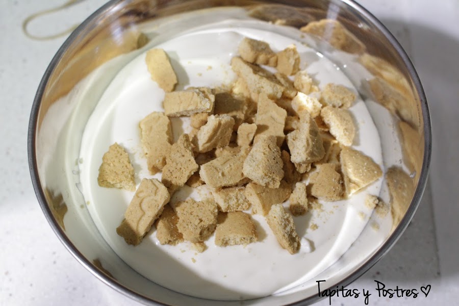 Vertemos la mezcla en el recipiente donde la vayamos a guardar y le añadimos las galletas troceadas.