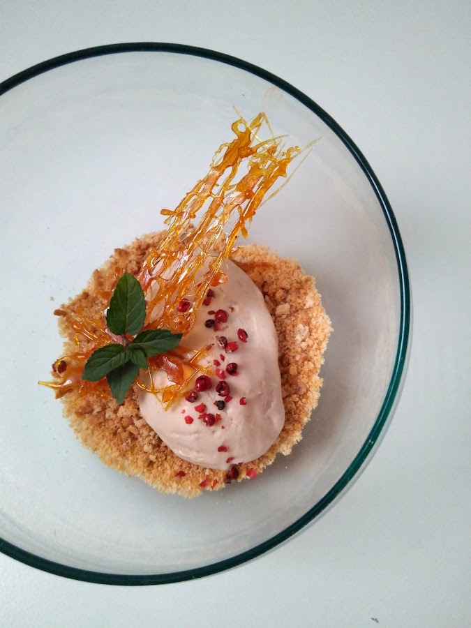 Decoramos con alguna bolita de pimienta rosa y en este caso yo he puesto además unos crujientes de caramelo y una base de galleta.