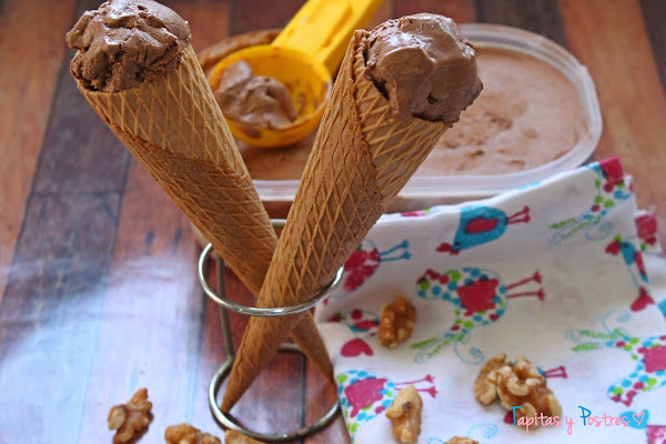 Tengo que advertiros que la receta original llevaba brandy y pasas. Yo no tenía pasas y he puesto nueces y el brandy lo he suprimido porque mi idea es que mis sobrinos pequeños coman de este helado. Si a vosotros os gusta, podéis añadir una cucharada.