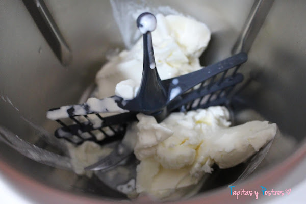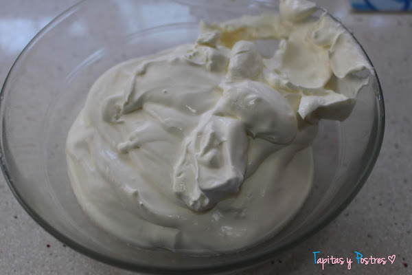 Colocamos la mariposa en el vaso de la thermomix y montamos la nata (crema de leche) que debe estar muy fría a velocidad 3 1/2. No ponemos tiempo pero debemos estar pendientes para que la nata (crema de leche) no se convierta en mantequilla. A los 25 o 30 segundos empieza a estar mas o menos lista, pero estad pendiente.