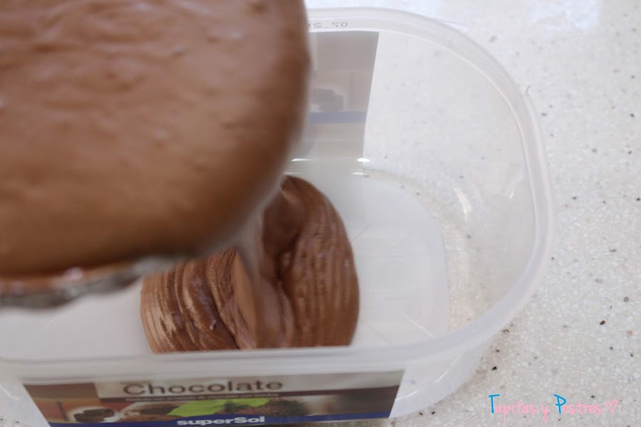 Vertemos la mezcla en un recipiente apto para el congelador y que tenga tapa. Yo uso envases reciclados de helados.