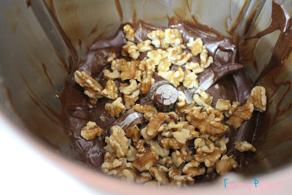 Tenemos que ver que se ha derretido bien el chocolate antes de añadir las nueces troceadas y mezclar 15 segundos a velocidad 2. En este paso es cuando podéis echar el licor si os gusta