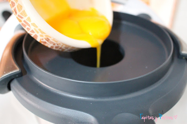 Ponemos la maquina en marcha a velocidad 4 y vamos añadiendo las yemas por el bocal una a una. Al acabar cocinamos las yemas dos minutos a 70º y velocidad 4.